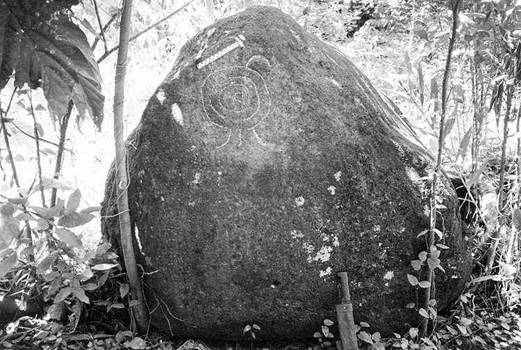 Derrière l’ancienne école d’Arue se trouve d’énormes roc de basalte qui proviennent certainement du centre du cratère du volcan de Tahiti Nui (au fond de la vallée de Papenoo). Gravés sur trois grandes pierres hautes de 1,50 m et espacées de 3 m, les pétroglyphes se caractérisent par un sillon tracé en spirale. Ils n’ont pas encore à ce jour été décryptés mais ils pourraient être liés à la légende de Hiro.