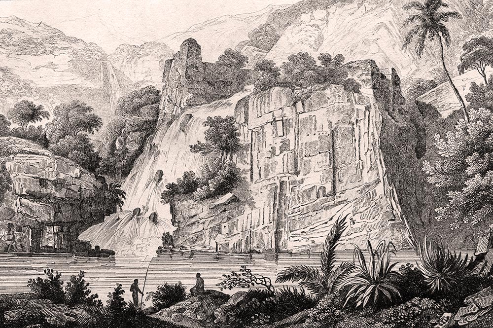… Nos guides commencèrent alors à nous encourager vivement à rebrousser chemin, mais bien que chaque pas devînt plus difficile, nous ne voulions pas abandonner sans connaître l’objet de notre recherche. Une autre motivation nous poussait aussi à continuer : l’espoir d’atteindre une cascade appelée Peeir (Te piha) par les naturels. En poursuivant notre chemin accidenté sur environ deux milles, nous reçûmes, en effet, la récompense de nos efforts. Elle est formée par une roche basaltique perpendiculaire, haute de plus de cent pieds, sa base s’étendant le long de la rive droite de la rivière sur plus de deux cents pieds. Au-dessus, le bord fait saillie sur quelques pieds ; un large mur d’eau en descend sans rencontrer de résistance jusqu’à ce qu’il atteigne quelques rochers isolés d’où l’eau tombe en plusieurs chutes dans un bassin profond et tranquille. Les piliers sont étroitement reliés entre eux mais cassés en plusieurs endroits »