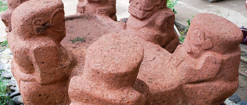 Sculpture des six chefs autour d’un Kooka à Vaipaee – Ua Huka